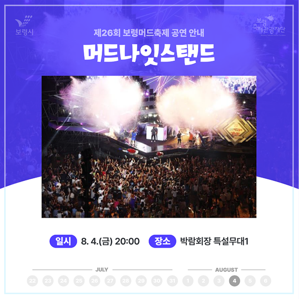 8월 4일(금) 20시에는 박람회장 특설무대1에서 머드나잇스탠드 공연이 열립니다. 제대로 된 불금을 즐길 수가 있겠네요! ㅎㅎ