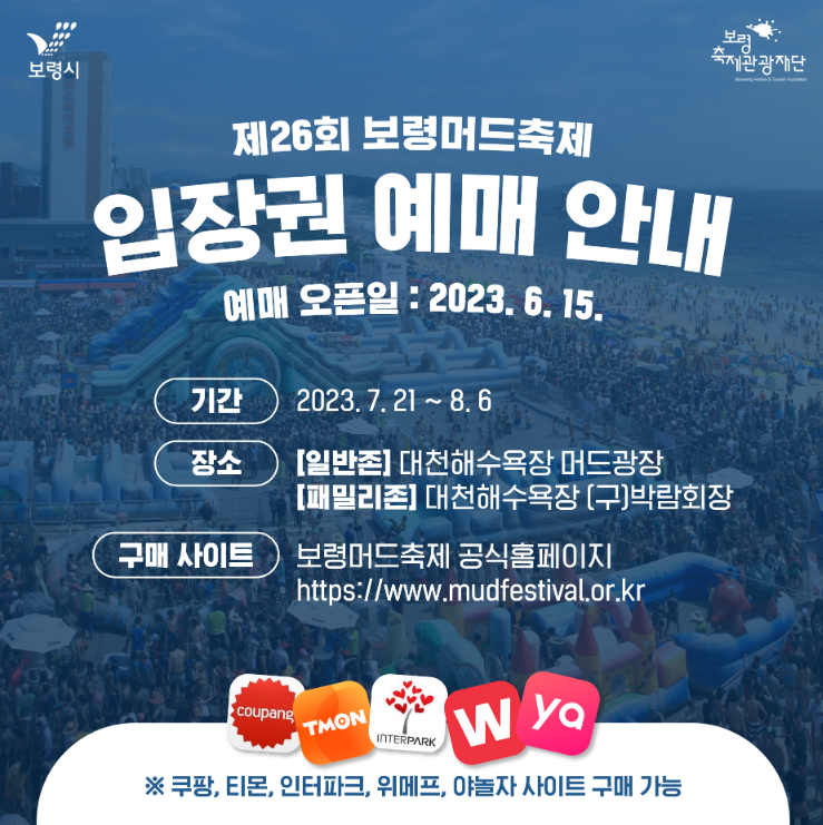 여름축제로 추천하는 2023 보령머드축제 입장권 예매는 이미 6월 15일부터 오픈되었어요. 보령머드축제 공식홈페이지를 비롯해 쿠팡, 티몬, 인터파크, 위메프, 야놀자 사이트에서 구매가 가능하다고 합니다.
